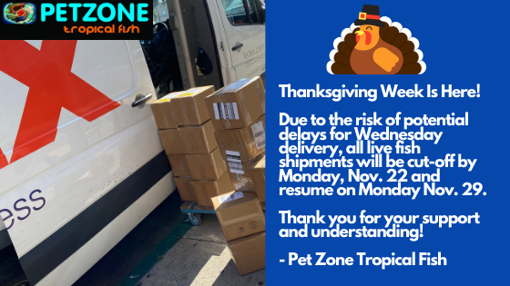 Due to the risk of potential delays for Wednesday delivery, all live fish shipments will be cut-off by Monday, Nov. 22 and resume on Monday Nov. 29.